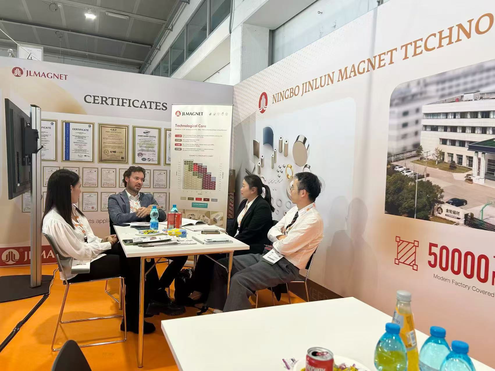 Na tejto výstave obchodní delegáti z celého sveta prešli cez hory a moria, aby sa zblížili, zapojili sa do vzájomných výmen s cieľom vytvoriť spoločný rozvoj obchodu. Spoločnosť Ningbo Jinlun Magnetic Materials sa zaoberala osobnými diskusiami s kupujúcimi z Talianska, Slovinska a iných krajín, pričom riešila otázky klientov týkajúce sa dodávateľského reťazca vzácnych zemín, výkonu triedy, procesov produktov, harmonogramov dodávok a exportných zásielok. Okrem toho sa uskutočnili hĺbkové výmeny názorov so zámorskými klientmi o aktuálnych požiadavkách a výzvach na medzinárodnom trhu s aplikáciami vysokovýkonných magnetických materiálov, čo viedlo k predbežným diskusiám a návrhu najnovších riešení vysokovýkonných magnetických materiálov. Dúfame, že prostredníctvom následnej úplnej implementácie zákazkových riešení pre aplikáciu magnetických materiálov, technologické inovačné schopnosti spoločnosti – charakterizované „vysokým výkonom, nízkymi nákladmi a ekologickými postupmi“ – prinesú klientom vylepšený produktový zážitok. Táto účasť na výstave nielenže zvýšila vplyv značky Ningbo Jinlun Magnetic Materials na medzinárodnom trhu s magnetickými materiálmi, ale prehĺbila aj porozumenie spoločnosti trendom na európskom trhu. To poskytuje neoceniteľné informácie pre budúcu expanziu na trhu, služby pre klientov v zámorí a pokračujúci prechod spoločnosti k ponukám produktov vyššej kategórie.