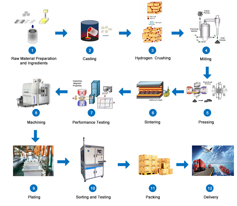 1. Dizajn zloženia: Dizajn zloženia spekaného NdFeB je veľmi dôležitý. Týka sa toho, či kvalita produktu a ukazovatele magnetického výkonu môžu spĺňať požiadavky zákazníka, pretože mnohé vnútorné magnetické vlastnosti materiálu, ako je magnetická polarizácia, Curieova teplota atď. Je určené zložením materiálu. Základným princípom návrhu kompozície je zabezpečiť dostatočne vysoký vlastný výkon pri komplexnom zohľadnení materiálových nákladov. (Náklady na suroviny tvoria asi 65 % – 90 % celkových nákladov na spekané materiály NdFeB. Za predpokladu splnenia požiadaviek používateľa na magnetickú výkonnosť by sa mali v čo najväčšej miere používať lacné komponenty a kovy vzácnych zemín a iné materiály z drahých kovov by sa mali používať menej)